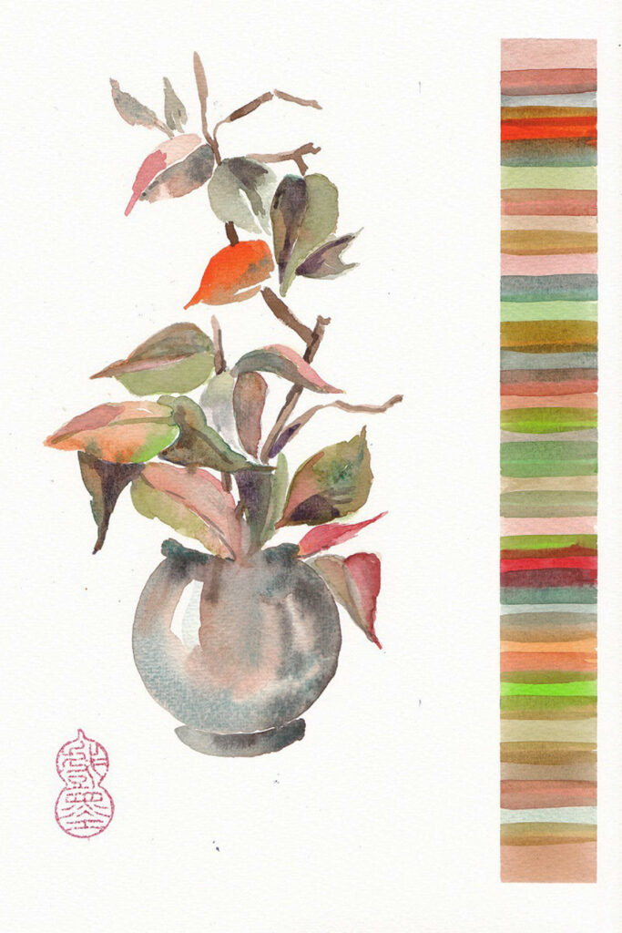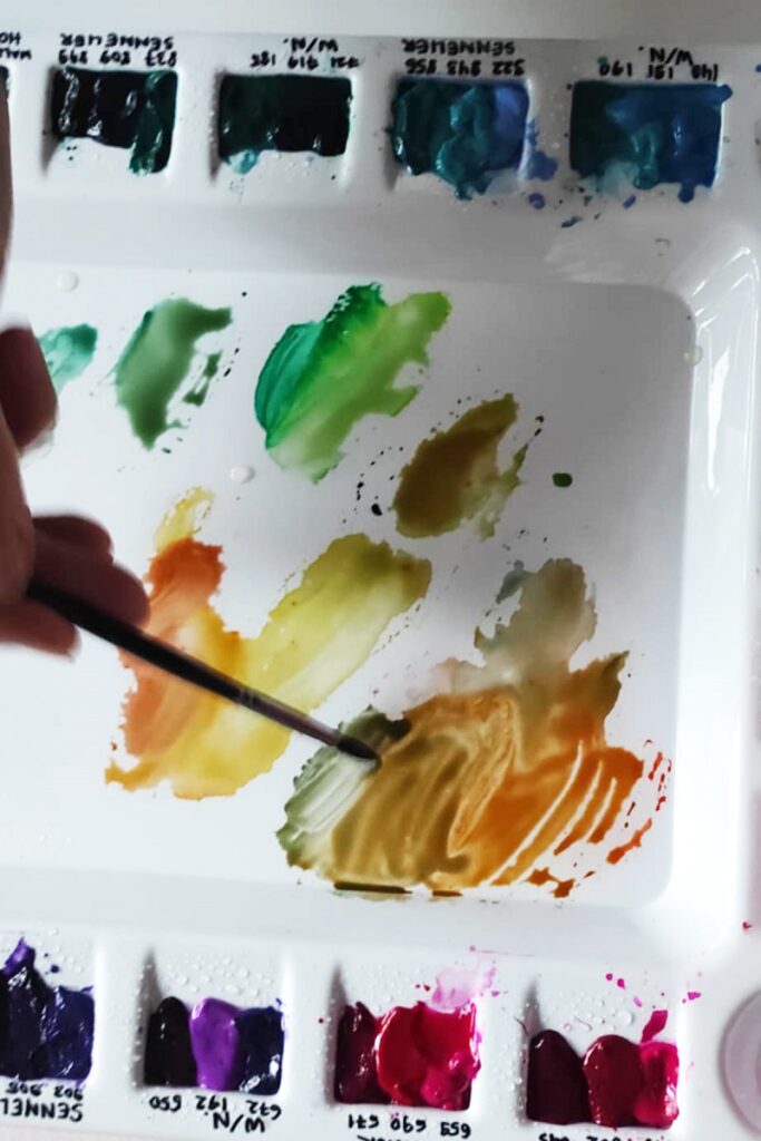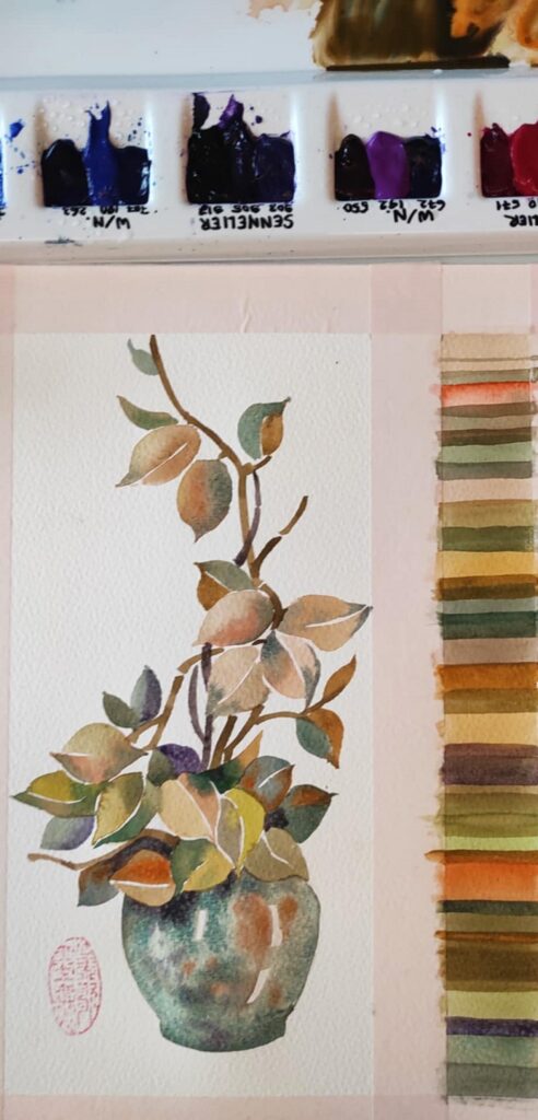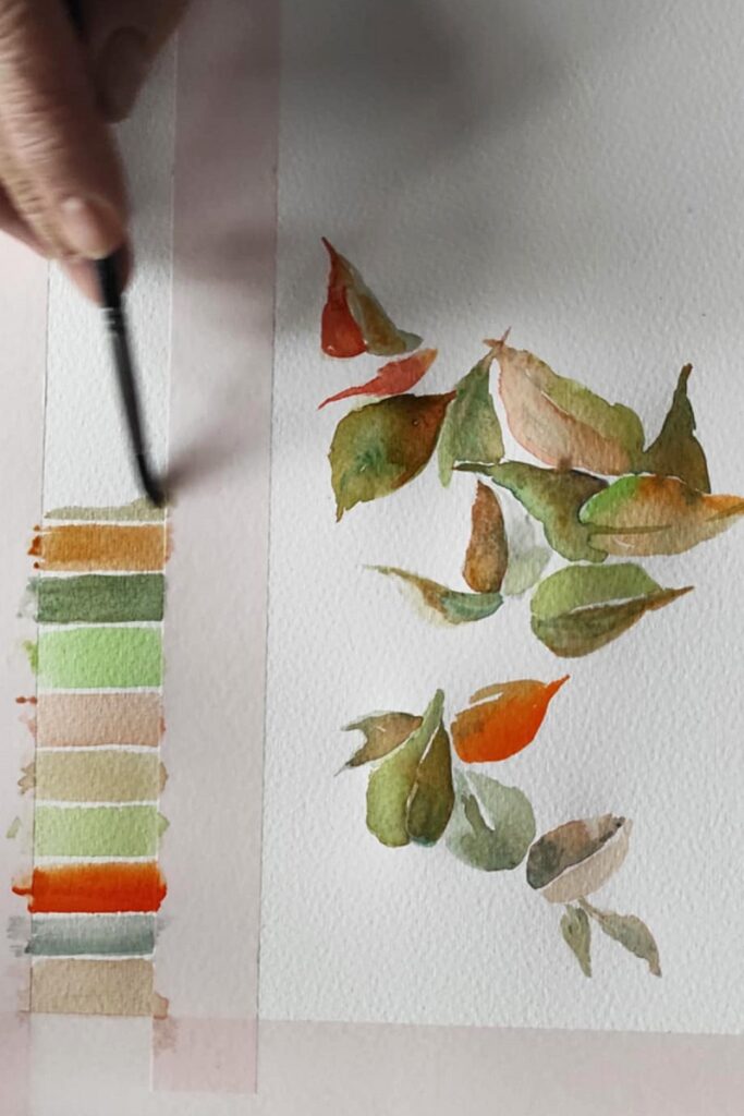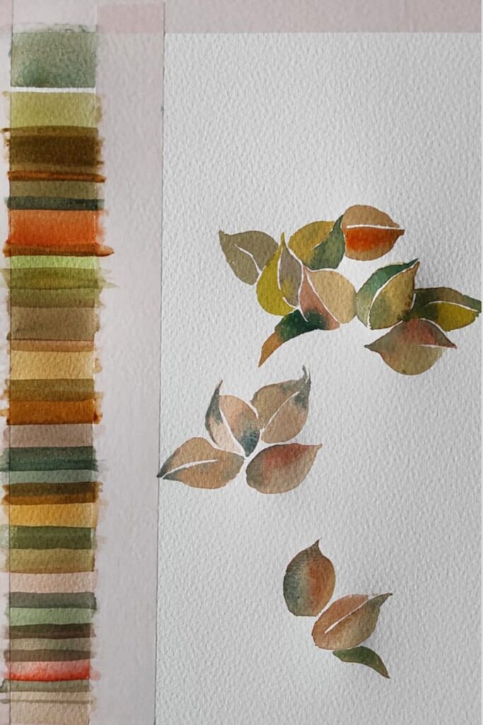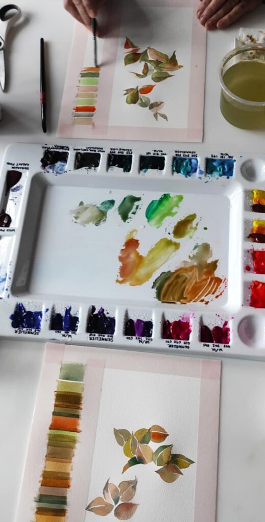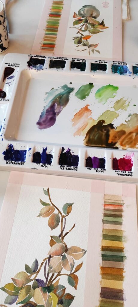 Värvimaailm on rikas, ühe enam tulevad värvinimetustesse sõnad loodusest ja argipäevast – hallitusseened puudel ja tolmulapi väsinud soe toon. Ja neid imatabaseid toone elust enesest segatakse värvitehastes kokku salastatud retseptide järgi. Meie aga segasime kirkaid akvarelle ja seekord muide oranze ja rohelisi ja türkiise ja kollaseidja satureeruvaid halle nagu nt Horadami Tundra Blue ning need omavahel annavad võrratuid sügiseseid toonikomplekte.