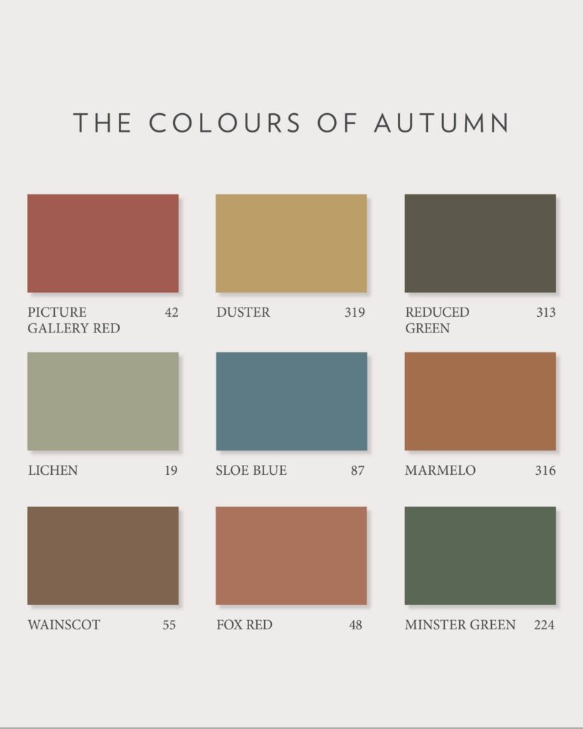 Jooksvalt selgus ka, et meie valitud koloriit on ka näiteks disainimaailmas just see õige selle hooaja sügiskoloriit põnevate värvitoonide nimetustega: picture gallery red (pildigalerii punane), duster (mis peaks tegelikult tolmulapi tooni tähendama), reduced green (“Reduced green” typically refers to an intense, earthly, neutral green, where the green pigment is significally reduced, making it appear more brown or grey to some eyes but still retaining a green undertone – vähendatud tuhmistatud roheline, mis näib rohkem pruuni või hallina kuid omab siiski rohekat alatooni), lichnen (hallitusseene toon), sloe blue (mustjas-hallikas-sinakas marjatoon), marmelo (üleküpsenud ebaküdoonia toon); wainscot (puupaneeli hall interjööris, koi karva hall), fox red (rebasekarva murtud toon) ja minster green ( a deep, mid-tone green inspired by the market town of Wimborne Minster in Dorset, England. The color is known for its “lived-in” quality and is recommended for traditional spaces, offering a more intense and aged green than other Farrow & Ball shades like Green Smoke and Calke Green. – taas selline ajalooga rohekas-hall toon, veidi suitsuse ja kriidi mahedusega roheline).