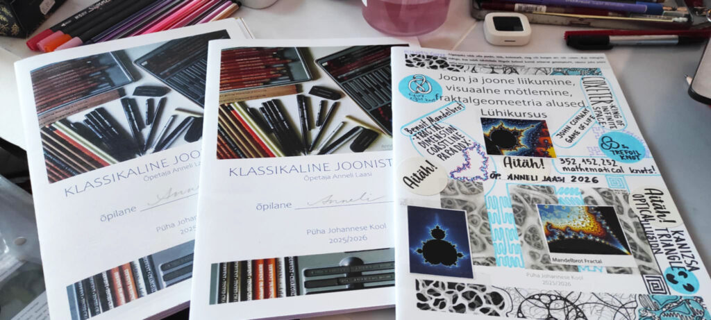 Koostasin paar uut vihikut oma armsale PJK-le – Klassikalise joonistamise ning Joon ja loone liikumine, visuaalne mõtlemine, fraktalgeomeetria alused. Lühikursus. Alustasime gümnasistidega juba joonistamisega ning tegime esimese sissejuhatava tunni kompositsiooni õpetusse… loob vaikselt.